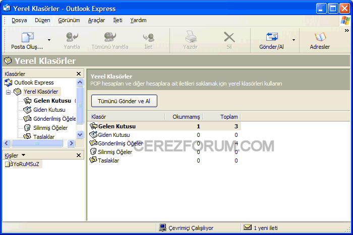 Artık GMail’i açmadan tüm mail gönderme, alma vs. işlemlerinizi Outlook Express aracılığı ile yapabilirsiniz. Denemek için GMail hesabınıza bir mail atın ve Outlook Express’i açıp soldaki Yerel Klasörler başlığını vurgulayın.